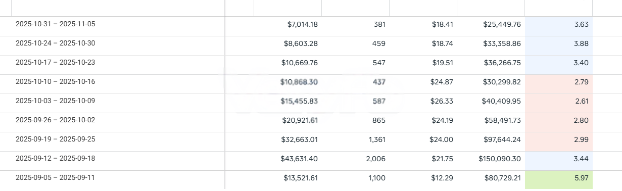 Over September–October 2025, our campaign ran with Andromeda’s algorithm at full capacity, delivering consistent efficiency across spend and conversions. Below are the unfiltered weekly performance trends (note: all figures reflect “Desired Actions” — adaptable to sales, leads, or app installs):