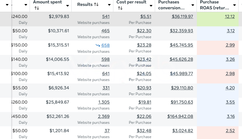 To test Andromeda’s adaptability to different spend levels, we ran parallel ad sets with varying daily budgets. The data below highlights how budget allocation and creative diversity impacted efficiency (all reflect “Website Purchases” as the desired action, but the pattern holds for other objectives):